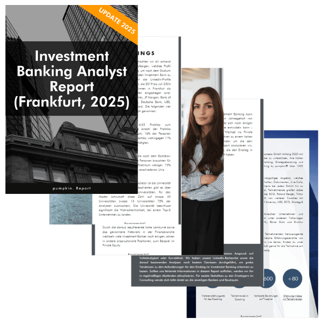Im Rahmen dieses Reports haben wir die LinkedIn-Profile von über 360 Personen analysiert, die 2019 bis August 2025 bei einer der folgenden Firmen in Deutschland als Investment Banking Analysten eingestiegen sind: Goldman Sachs, Morgan Stanley, JP Morgan, Bank of Amerika, Citi, Credit Suisse, Deutsche Bank, UBS, Barclays, Rothschild und Lazard. Unsere Recherche ermöglichte uns repräsentative Aussagen über folgende Bereiche: